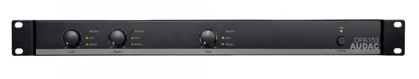 The DPA series amplifiers are Class-D power amplifiers designed to meet the specialized needs of sound contractors for multi-zone distributed speaker systems. They are designed in six different models of Class D power amplifiers, divided in three different architectures to meet the requirements for all kinds of applications. They combine the best of all features in one single series of amplifiers, providing an outstanding sound quality with all the known advantages of Class-D amplifiers such as the excellent efficiency and very low heat dissipation. Due to the complete passively cooled entity only a minimal of maintenance is needed while ensuring maximum reliability. The small size of a single rack space make them very interesting for fixed rack mounting as well as mobile applications. The DPA153 is built as a two channel (stereo) amplifier, with an additional channel for powering a subwoofer cabinet. It contains an active crossover network with a frequency of 120Hz and advanced protection circuitry which protects against DC malfunctioning, short circuit, overheating and overload. The signal input connections are accommodated with balanced XLR connectors and signal link through with other amplifiers is possible using the XLR output connectors. The operation mode can be selected between Stereo mode, Bridge mode and Parallel mode. The output connections are accommodated with Euro-Terminal blocks.