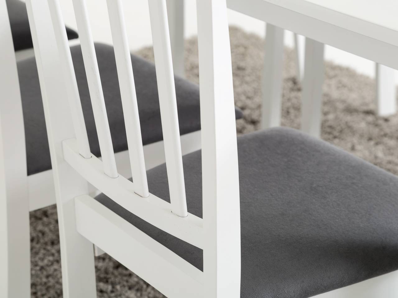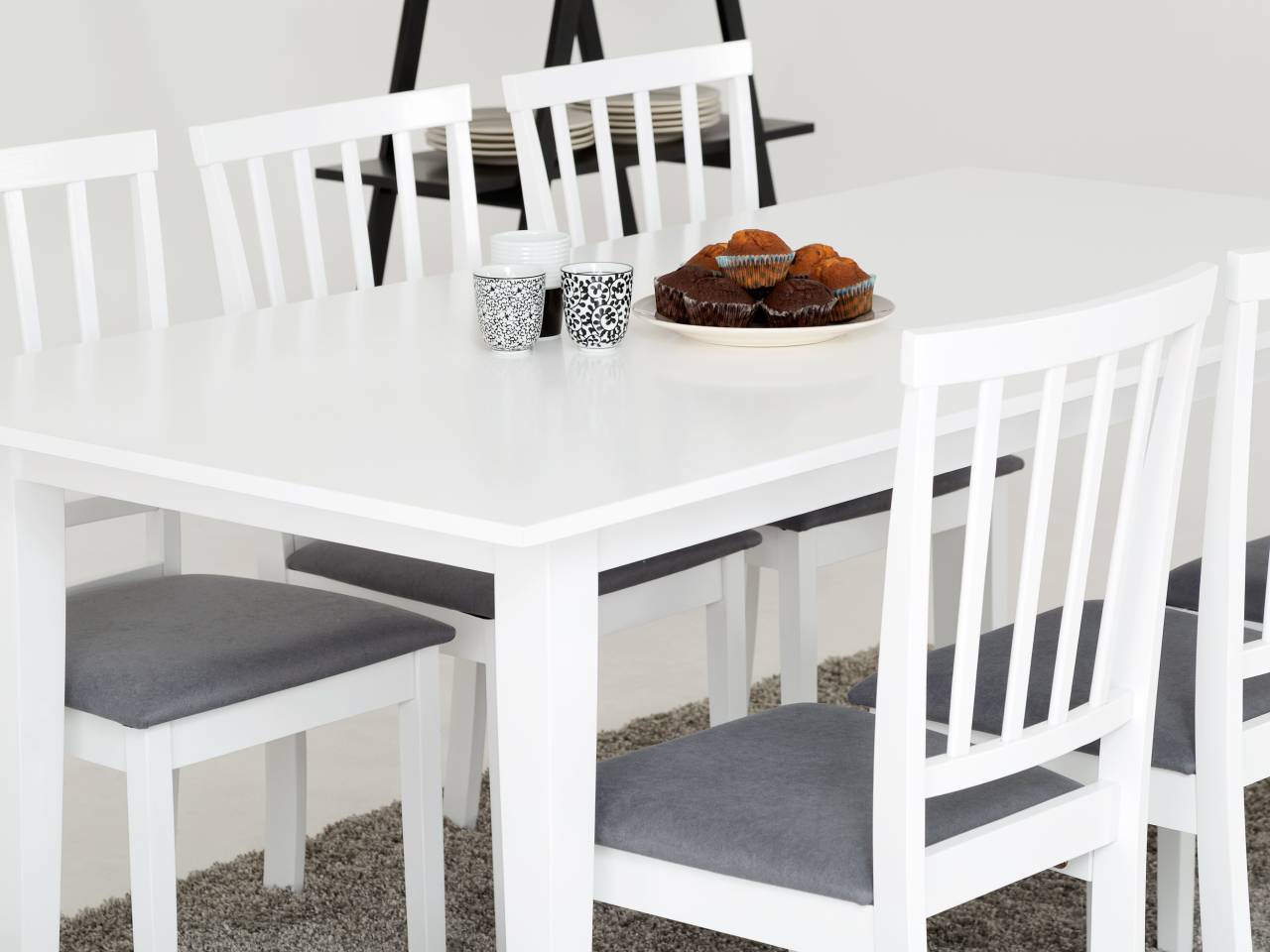 Matgrupp bestående av ett vitlackerat förlängningsbart bord och sex vita stolar med grå sits. Bord och stolar är i MDF. Mått bord: L180-220 B90 H76 cm. Mer information
