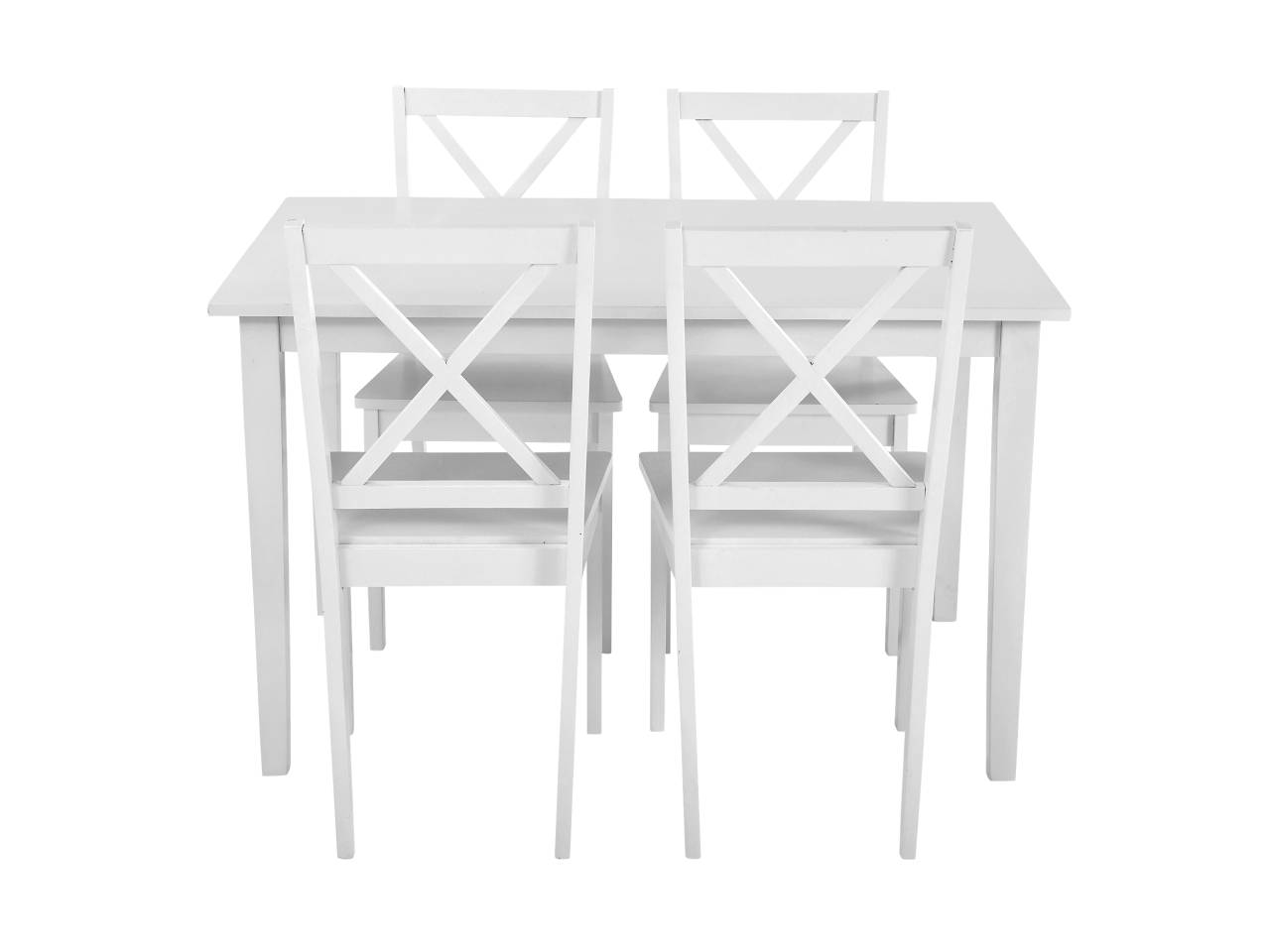 Matgrupp bestående av ett matbord och fyra stolar i vitlackerat gummiträ.