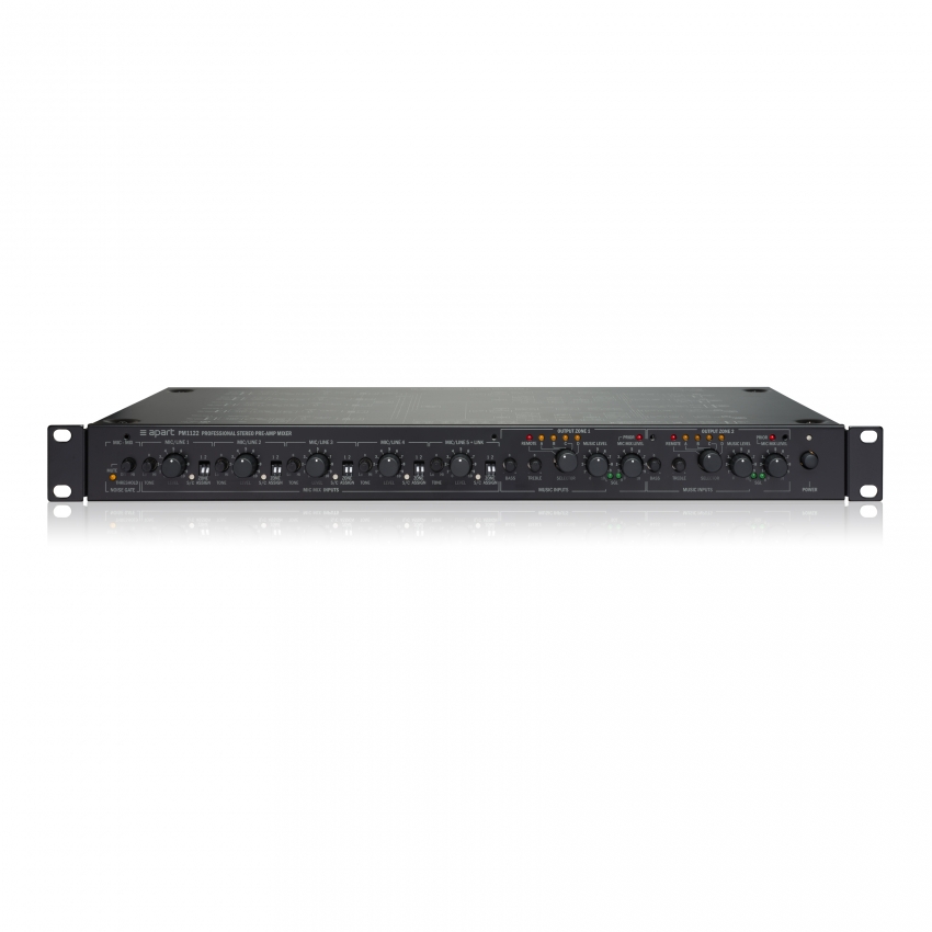 The PM1122 is a stereo pre-amplifier ideal for 1 and 2 zone applications where you want to have a different volume setting and where a different sound source is needed.