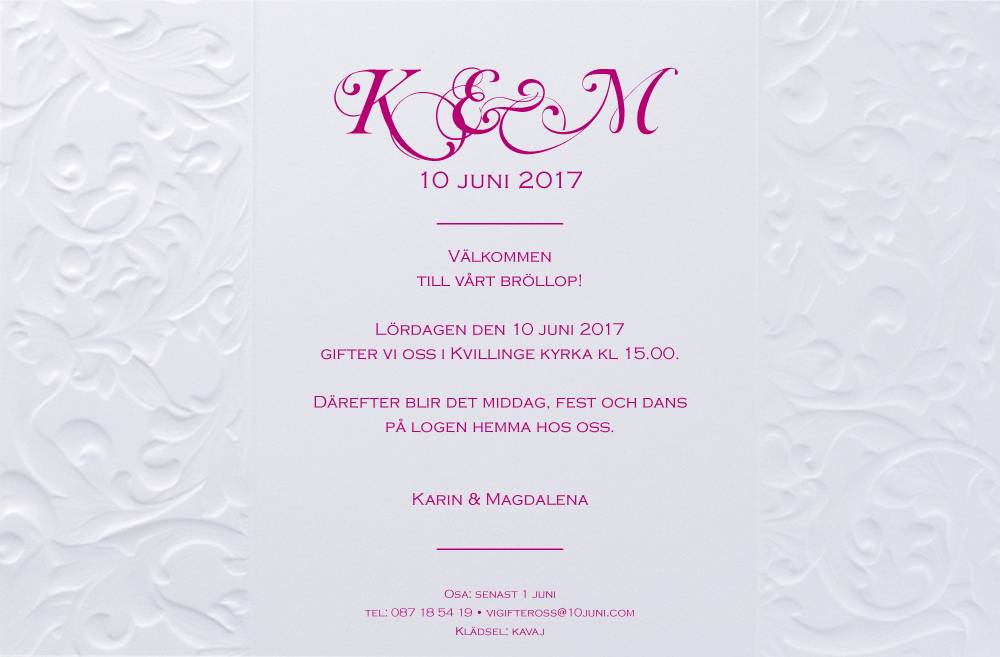 Florence är ett elegant kort med en vacker prägling på ett vitt slätt papper. Kortet försluts på ett smakfullt sätt med ett organzaband.
