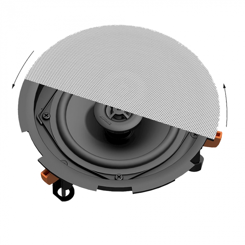 Det heltäckande gallret har den snabbmonterade TwistFix™-funktionen, och är helt utan den vanliga kragringen runt gallret. Det gör att högtalaren blir än mer diskret och smälter fint in mot taket.
