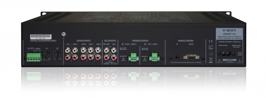 For a long time, installers worldwide have been unhappy with consumer electronics and they were looking for a professional integrated amplifier for use in commercial environments, boardrooms or small businesses designed for 24/7 operation. Therefore Apart developed the CONCEPT1T, a stereo or two mono channel (2 x 60 watts in 100 volt) amplifier for small and medium-sized projects.