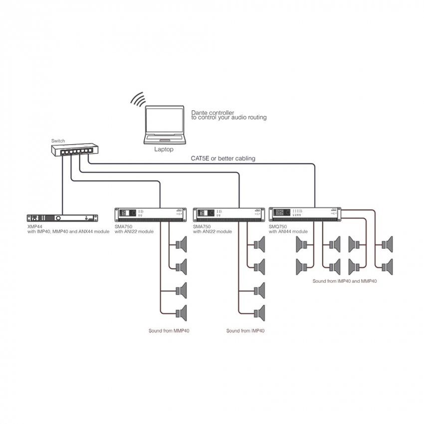 Modulen gör det även möjligt att skicka ljudsignaler vidare i Dante-nätverket, även om de ansluts till SMA/SMQ förstärkaren analogt.